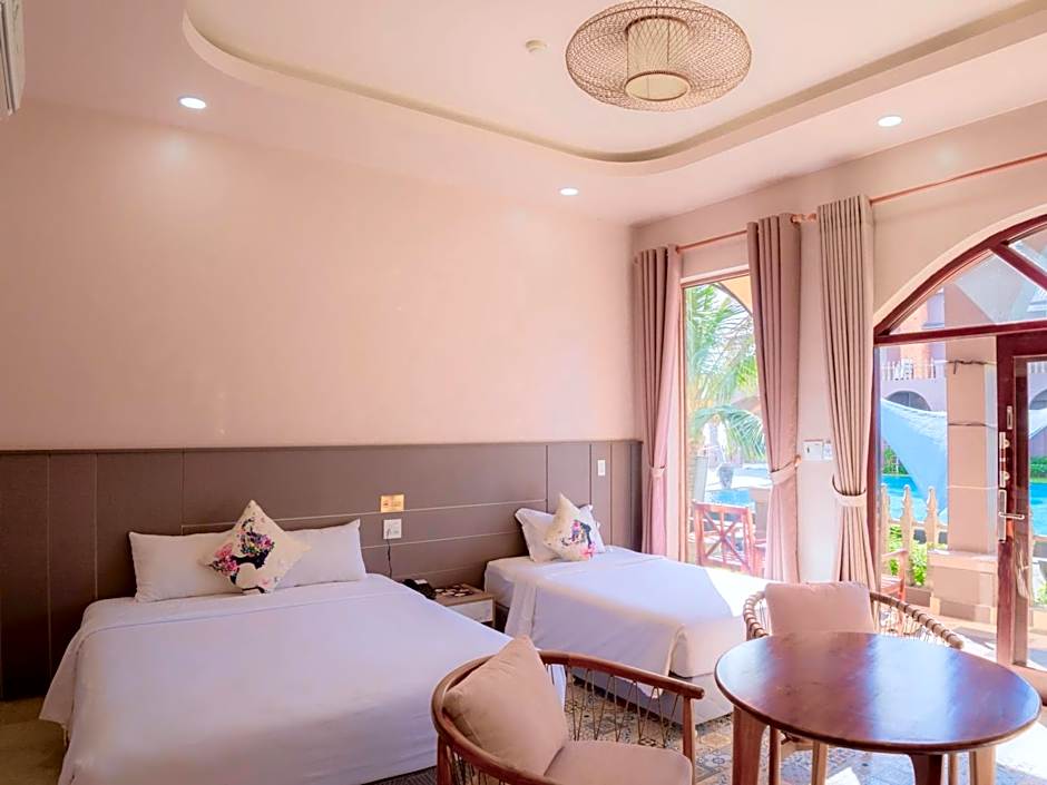 The room is elegant and delicately designed, overlooking the green garden. The room is arranged with a 1m6 double bed and a single bed for up to 3 guests to rest.